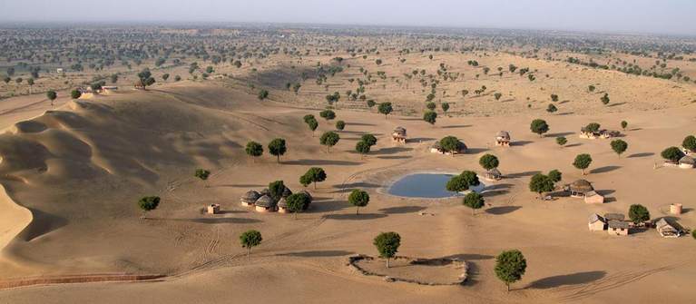 Jodhpur has the nearest airport and railway station, from whereon private buses on cars can be used to travel to Khimsar. It takes nearly an hour and a half on the good quality road. Being in the heart of the desert, days are hot while nights are cool.