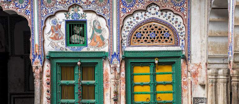 The fort has a painted archway with scenes from the life of Lord Krishna. The rooms are also decorated with similar paintings, apart from beautiful carvings and stunning mirror work. Its Durbar Hall has several priceless antiques and paintings. The fort has battlements overlooking the town, its lush gardens are home to many peacocks and there are curiosities like marble fountains and turrets. No two rooms in the fort are alike.