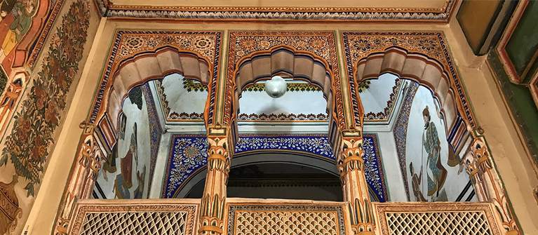 The havelis of Shekhawati Rajasthan are known the world over for their wall paintings. The themes of these frescoes depict gods, kings, flowers, arabesques and scenes from daily life. The Shekhawati paintings also depict Europeans, as can be identified by their hats in a sea of turbans, in scenes of infantry in opposite sides.