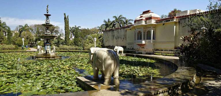 Four water pools, chiseled kiosks and marble elephants add to the beauty of the garden. A lotus pool and bird-fountains give it a truly romantic feel. A pavilion of rain fountains was added to this garden by Maharana Bhopal Singh. These fountains were procured from England. Presently, there is a museum in its grounds exhibiting the huge collection of royal households, ancient pictures and stuffed animals that were hunted by the royals.